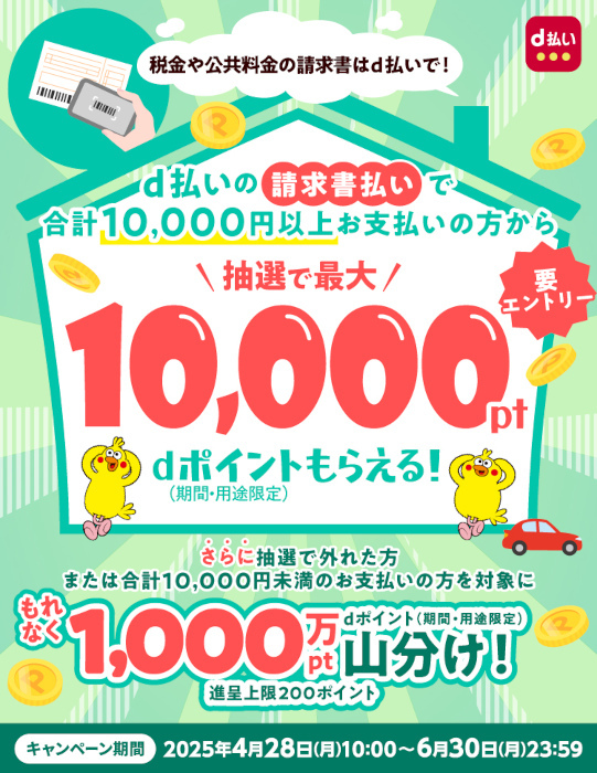 - 「d払い請求書払いのご利用でdポイントが抽選or山分けでもらえる!キャンペーン」=https://service.smt.docomo.ne.jp/keitai_payment/campaign/bill-payment_2504/