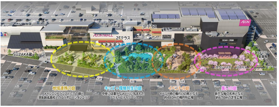 「イオンモール須坂」10月3日オープン 「イオンシネマ」や長野県初57店舗を含む専門店約170店舗 2025/06/10 17:30 Tweet 1/5 「イオンモール須坂」の外観イメージ 記事詳細ページ 注目の記事 長野県須坂市で開発中の「(仮称)イオンモール須坂」、2025年秋開業 CFCに実店舗を併設した次世代スーパー、2026年開業 シネコンも併設 石川・野々市市にショッピングスクエア「アークスクエア御経塚」誕生 ヤマダデンキ+ホームセンタームサシ+イオンスタイル 大阪にヤマダデンキ+スーパービバホーム+ロピアの「アークスクエア茨木」オープン 外部リンク 「イオンモール須坂」= https://suzaka.aeonmall.com/ イオンモール=https://www.aeonmall.com/