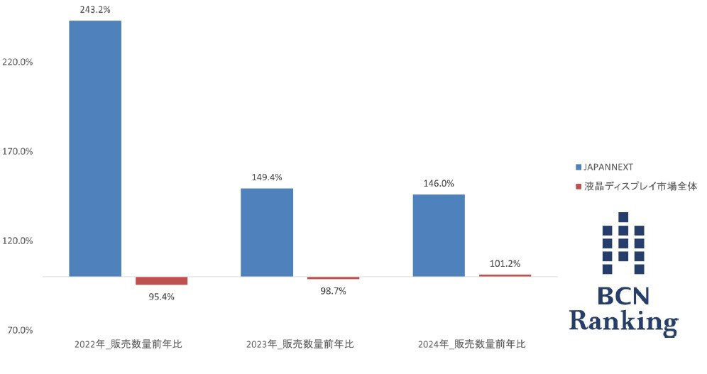 液晶ディスプレー市場でJAPANNEXTが販売好調!人気の理由とエッジが効いたおすすめモデルを紹介 2025/07/04 18:00 Tweet 1/6 JAPANNEXTにおける前年同期比の推移(時系列パネル) 記事詳細ページ 注目の記事 フルHDのゲーミングディスプレイが1万7980円! カラーは全5色 49インチのウルトラワイドゲーミングディスプレイを19万9800円で、JAPANNEXTが販売 23.8インチのフルHDゲーミングディスプレイが1万9980円! JAPANNEXTから Amazon限定で1万6980円、23.8インチのゲーミングディスプレイがJAPANNEXTから 75インチの4K大型液晶ディスプレイを19万9980円で! JAPANNEXTから 外部リンク JAPANNEXT=https://jp.japannext.com/