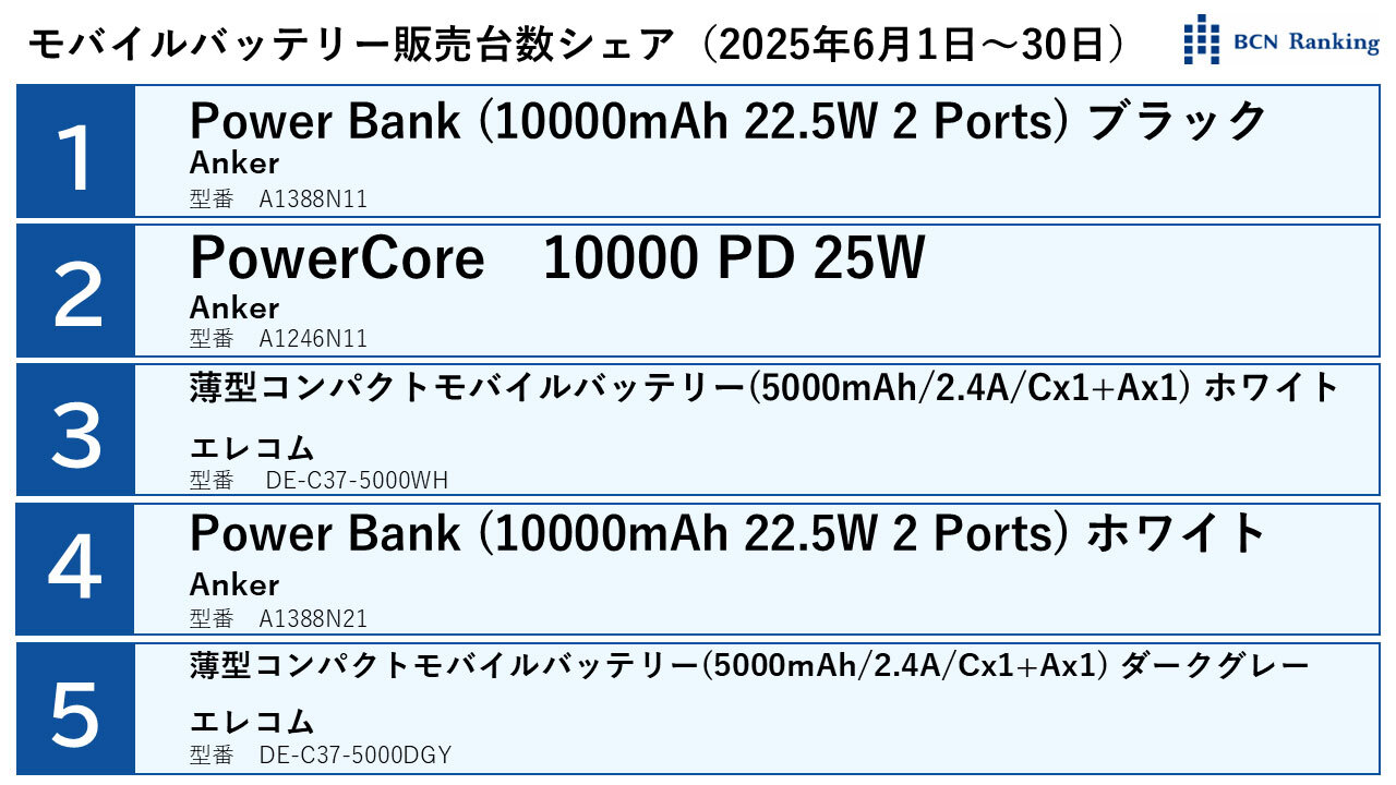 【2025年夏 車帰省】車内で快適に過ごせるスマホアプリやデジタル機器を紹介 2025/07/14 17:00 Tweet 1/13 「ToPick」飲み会、デートで使える話題提供アプリ 記事詳細ページ ※Amazonのアソシエイトとして、BCN+Rは適格販売により収入を得ています。 Anker PowerCore 10000 PD Redux 25W(モバイルバッテリー 10000mAh 大容量)/コンパクト設計/高速充電/ポータブル/Power Delivery対応/PPS規格対応/PowerIQ搭載/PSE技術基準適合 ¥5,980 Amazonで見る エレコム モバイルバッテリー 5000mAh 12W コンパクト 薄型 軽量 入力(Type-C×1) 出力(Type-C×1、USB-A×1) PSE認証 おまかせ充電対応 【iPhone Android 各種対応】 ホワイト DE-C37-5000WH ¥1,719 Amazonで見る Anker Power Bank (10000mAh, 22.5W, 2 Ports) (モバイルバッテリー 10000mAh 最大22.5W出力 USB-C & USB-C ケーブル付属 ディスプレイ搭載) 【PD/PowerIQ搭載/PSE技術基準適合】iPhone 17 / 16 / 15 / Android/iPad その他各種機器対応 (ブラック) ¥4,490 Amazonで見る 注目の記事 暑さ対策はスマートに! 今すぐ使えるデジタル涼感グッズ 「推し活」の決定的瞬間を逃さない! 最新スマホカメラ完全ガイド 暑さの死角なし、「スポットクーラー」おしえて! モバイルバッテリーの安全な使い方を紹介! 夏のビーチを楽しむ方法も【特集まとめ】 家中どこでも氷を持ち運ぶ!最短6分でつくれる「家庭用製氷機」