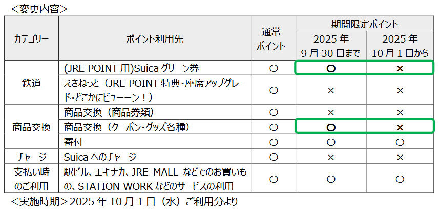 JRE POINT、期間限定ポイントから「Suica グリーン券」への交換が不可に、2025年10月1日から 2025/07/19 19:05 Tweet 1/3 「モバイルSuica アプリ」から「JRE POINT」を交換できるように。一方、期間限定ポイントの利用先は減少する 記事詳細ページ 注目の記事 デジタル家電の2025年上半期販売数No.1メーカーは? BCN調べ JR東日本、今後10年間で「Suica」の機能をアップデート 2026年秋に「コード決済」を追加 関東の私鉄・JR 特急料金がポイントで支払える「チケレス」サービスまとめ JR東日本、「JRE POINT ステージ」の達成状況が確認しやすく 特典も追加 2023年春以降にJR西日本・JR東海も開始予定! 全国に広がる“沿線共通ポイント” 外部リンク 「JRE POINT 10周年特設サイト」=https://www.jrepoint.jp/10th-anniversary 「JRE POINT」=https://www.jrepoint.jp/ JR東日本=https://www.jreast.co.jp/