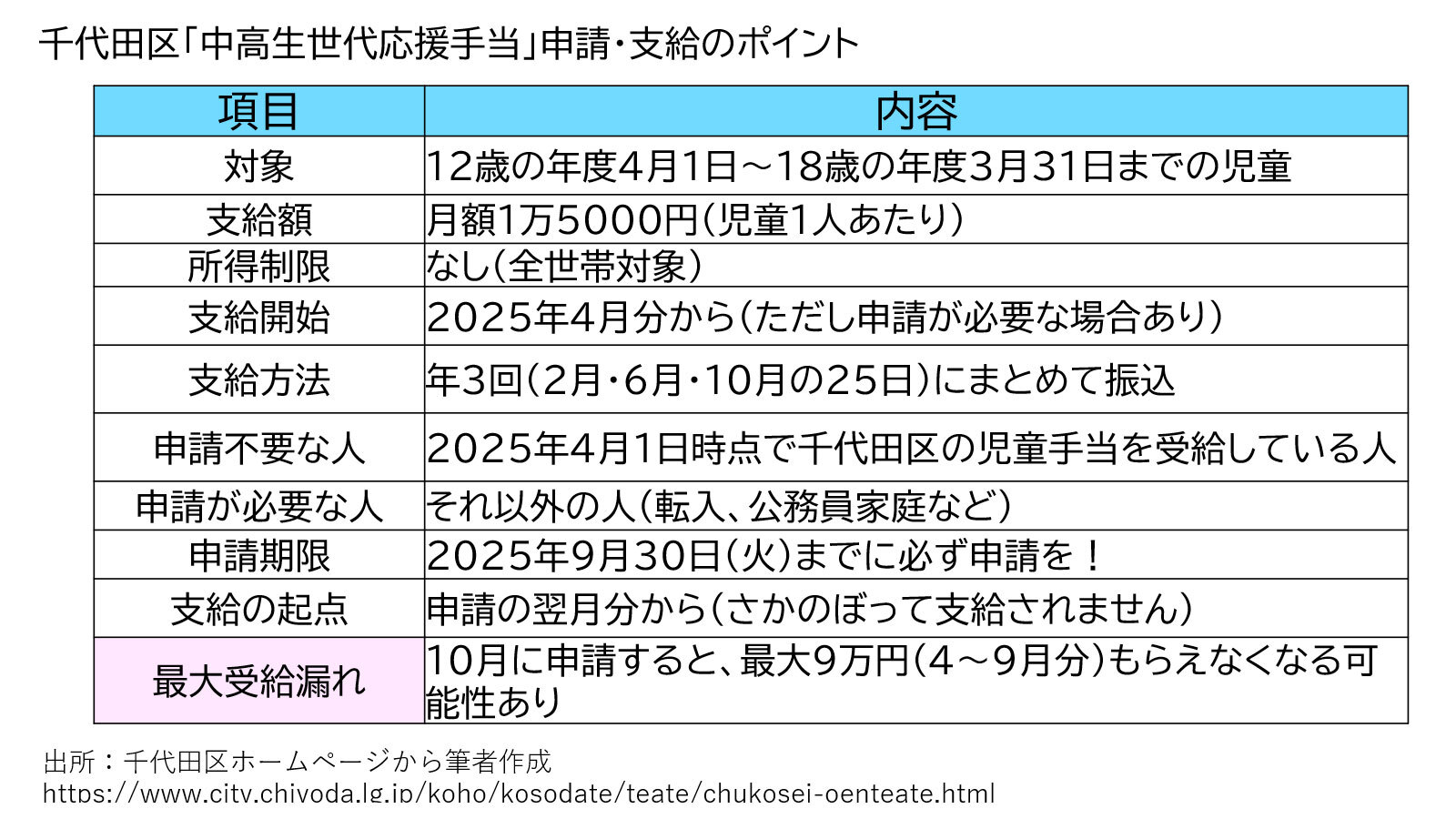 千代田区独自・月額1万5000円の「中高生世代応援手当」 申請は原則不要、必要な場合は9月30日までに 2025/08/22 18:00 Tweet 1/2 千代田区独自の制度「中高生世代応援手当」の概要 記事詳細ページ 注目の記事 従来の保険証に代わる「資格確認書」に関する暫定的な運用が1年延長 理由は「現場の混乱を避けるため」 独自の補助制度で食洗機の購入を後押し! パナソニックと地方自治体の実証実験 ベビーカーレンタルのメリット・デメリット 後悔しない選び方や賢い活用法を紹介 18歳以下に「月額5000円」 東京都の「018サポート」が9月から開始 10月1日から変わる「児童手当」をわかりやすく解説~制度変更編~ 外部リンク 「千代田区 中高生世代応援手当」=https://www.city.chiyoda.lg.jp/koho/kosodate/teate/chukosei-oenteate.html 「千代田区 給付型奨学金事業」=https://www.city.chiyoda.lg.jp/koho/kuse/koho/pressrelease/r7/r707/20250718.html