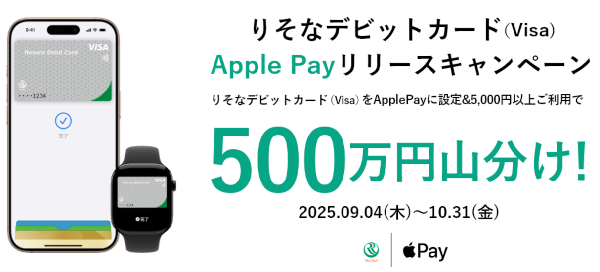 最大2%還元の「りそなデビットカード(Visa)」、Apple Pay対応開始 2025/09/06 07:10 Tweet 1/1 「りそなデビットカード(Visa)」Apple Payリリースキャンペーンの告知 記事詳細ページ 注目の記事 いつでもどこでも2%還元のポイント還元特化型デビット、りそな銀行から Visa、「Apple Pay対応」をデビットカードに拡大 ソニー銀行などが対応 Kyash、Apple Payで「Visaのタッチ決済」に対応 最大500円相当まで10%還元 クレジットカード&タッチ決済の話題振り返り! 2025年8月のトピックス 公共交通機関にも広がるVisaのタッチ決済 手持ちのカードは対応済み? 外部リンク 「りそなデビットカード(Visa) Apple Payリリースキャンペーン」=https://www.resonabank.co.jp/kojin/visa_debit/landing_applepay/cam.html りそな銀行=https://www.resonabank.co.jp/ 「Apple Pay」= https://learn.applepay.apple/how-to-jp 最新動向がすぐわかる キャッシュレス決済=https://www.bcnretail.com/topics_detail20/id=119031
