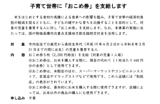全国で広がる「おこめ券」配布による家計支援 対象者は「もらいそびれ」に注意 2025/09/26 18:00 Tweet 1/1 埼玉県日高市の2025年度「おこめ券配布」に関する告知(対象の児童1人につき2200円を保護者などに支給) 記事詳細ページ 注目の記事 パナソニック、炊飯器マスターが教える、意外と知られていないおいしいごはんの炊き方 米や食料品の給付する「大阪府子ども食費支援事業」の第三弾がスタート! ビックカメラとソフマップ、東京・豊島区と「デジタルデバイド対策」で協定 戸建も加わり本格的にスタート 「東京こどもすくすく住宅認定制度」とは? 「東京ゼロエミポイント」拡充 高齢者が省エネエアコンを購入すると8万円割引 外部リンク 「大阪府子ども食費支援事業(第4弾)」=https://www.osaka-kodomoshien.com/kodomo/ 「『子育て世帯への食料支援事業(おこめ券の配付)』(東京都)」=https://www.city.toshima.lg.jp/261/kosodate/kosodate/teate-jose/2507031427.html