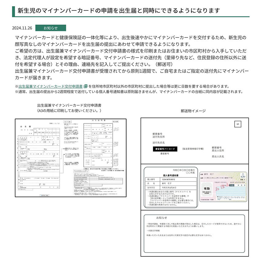 「出生届兼マイナンバーカード交付申請書」を使って出生届と同時にマイナンバーカードを申請すると、受け取り時に本人確認は必要なく、自宅または指定の送付先に届く(2024年11月26日以降)
