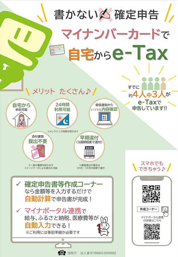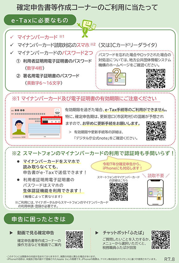 2025年度分の確定申告は「iPhoneのマイナンバーカード」に対応 「マイナポータル連携」も拡充 2025/10/29 18:00 Tweet 1/4 「マイナンバーカード+e-Tax」の利用案内(2025年8月) 記事詳細ページ 注目の記事 今さら聞けない!? マイナンバーカードの基礎知識【電子証明書の更新編】 2025年6月24日から「iPhoneのマイナンバーカード」開始 2025年1月から「e-Tax」がさらに便利に 「スマホ用電子証明書」に対応など 年末調整の電子申請 XML形式の控除証明書データ取り込みなら添付書類不要 確定申告をより簡単に、より便利に 期待高まる税務行政のDX 外部リンク 「国税庁 令和7年分の確定申告はスマホとマイナポータル連携でもっと便利に!」=https://www.nta.go.jp/taxes/shiraberu/shinkoku/r7_smart_shinkoku/index.htm 「マイナポータル連携特設サイト(国税庁)」=https://www.nta.go.jp/taxes/tetsuzuki/mynumberinfo/mynapo.htm デジタル庁=https://www.digital.go.jp/ 国税庁=https://www.nta.go.jp/index.htm