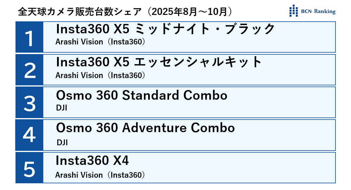 ビデオカメラ市場の勢力図が大激変!全景カメラ人気でInsta360が躍進、シェア拡大の要因は? 2025/12/18 18:00 Tweet 1/6 全天球カメラのメーカー別販売台数シェア 記事詳細ページ 注目の記事 話題のコンデジ 家電量販店にオススメ製品を聞いてみた ビックカメラ新宿東口店 話題のコンデジ 量販店にオススメ製品を聞いてみた ケーズデンキ 東京ベイサイド新浦安 人気集めるコンデジ 量販店にオススメ製品を聞いてみた エディオン横浜西口本店 【2025年最新】旅行をもっと楽しく!旅先で後悔しない「デジタルアイテム」 アクションカメラを守る! ハクバの「DJI」「Insta360」専用「耐衝撃×撥水」液晶保護フィルム 外部リンク Arashi Vision(Insta360)=https://www.insta360.com/jp/