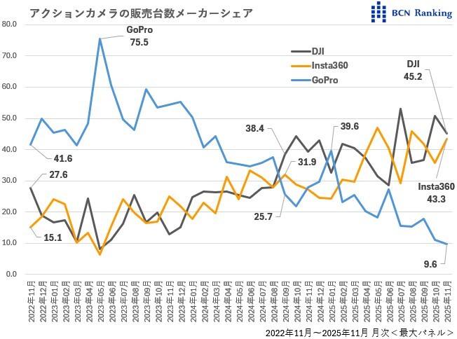 GoProがシェア急落、それでも伸びるアクションカメラ市場【道越一郎のカットエッジ】 2025/12/21 18:30 Tweet 1/3 シェアが1割を切ったGoPro。現在ではDJIとInsta360の2強だ 記事詳細ページ 注目の記事 アクションカメラでDJI JAPANが上半期No.1! 「Osmo Action 5 Pro」に期待 止まらないOSMO POCKET 3無双――異例のメガヒットビデオカメラ人気の秘密【道越一郎のカットエッジ】 DJIがデジタルビデオカメラ部門で初めて年間No.1を獲得【BCN AWARD 2025】 圧倒的売上のOsmo Pocket 3、1位連続11カ月──ビデオカメラ市場を変えたDJI【道越一郎のカットエッジ】 単価25%上昇でも回復の兆しが見えてきたビデオカメラ市場 外部リンク GoPro=https://gopro.com/ja/jp DJI=https://www.dji.com/jp/products/handheld-imaging-devices?site=brandsite&from=nav Insta360=https://www.Insta360.com/jp/