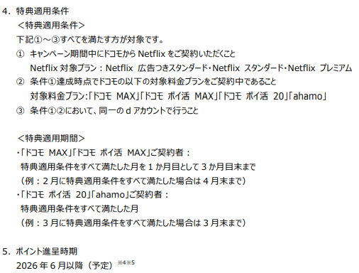最大3カ月お得! 「ドコモ×Netflix 春のポイント大還元祭」 3月31日まで 2026/01/28 18:30 Tweet 1/2 「ドコモ×Netflix 観るなら今! 春のポイント大還元祭」によるポイント還元イメージ 記事詳細ページ 注目の記事 「Netflix」や「Apple Music」「YouTube Premium」にお得に加入できる方法教えます ヒントはスマホ ソフトバンクユーザー・「SoftBank 光」の契約者向けに、「Netflix」広告つきスタンダードプランのキャンペーン Netflix「ストレンジャー・シングス 未知の世界」とのコラボウオッチ ドコモ、「爆アゲ セレクション」に「dアニメストア」を追加 WBC侍ジャパンの快進撃で、あの製品の売上が急増! テレビは? 外部リンク 「ドコモ×Netflix 観るなら今! 春のポイント大還元祭」=https://ssw.web.docomo.ne.jp/bakuage/netflix/ 「爆アゲ セレクション」=https://ssw.web.docomo.ne.jp/bakuage/ Netflix=https://www.netflix.com/jp/ NTTドコモ=https://www.docomo.ne.jp/