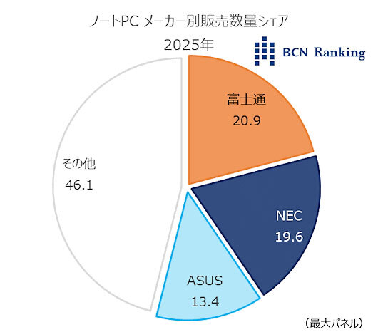 FCCLがノートPCの年間No.1を2年連続で獲得【BCN AWARD 2026】 2026/01/31 18:00 Tweet 1/1 ノートPC メーカー別販売数量シェア(2025年) 記事詳細ページ 注目の記事 KODAKが初の年間首位、デジタルカメラ レンズ一体型部門【BCN AWARD 2026】 ハードウェアの注目部門をピックアップ! 【BCN AWARD 2026 1月19日発表】 ゲーミング5部門新設! 注目ジャンルの年間No.1が明らかに 【BCN AWARD 2026 来年1月19日発表】 毎年1月発表! 年間No.1メーカーを称える「BCN AWARD」とは? 外部リンク 「BCN AWARD」=https://www.bcnaward.jp/award/ 「BCN AWARD 2026」=https://www.bcnaward.jp/award/gallery/date=2026 「BCNランキング」=https://www.bcnretail.com/research/ranking/ BCN=http://www.bcn.co.jp/ BCN総研=https://ri.bcnretail.com/
