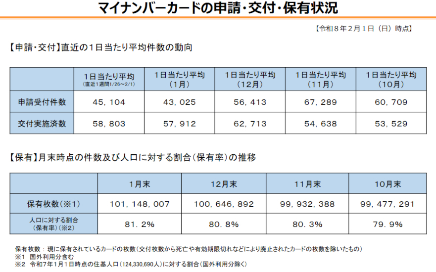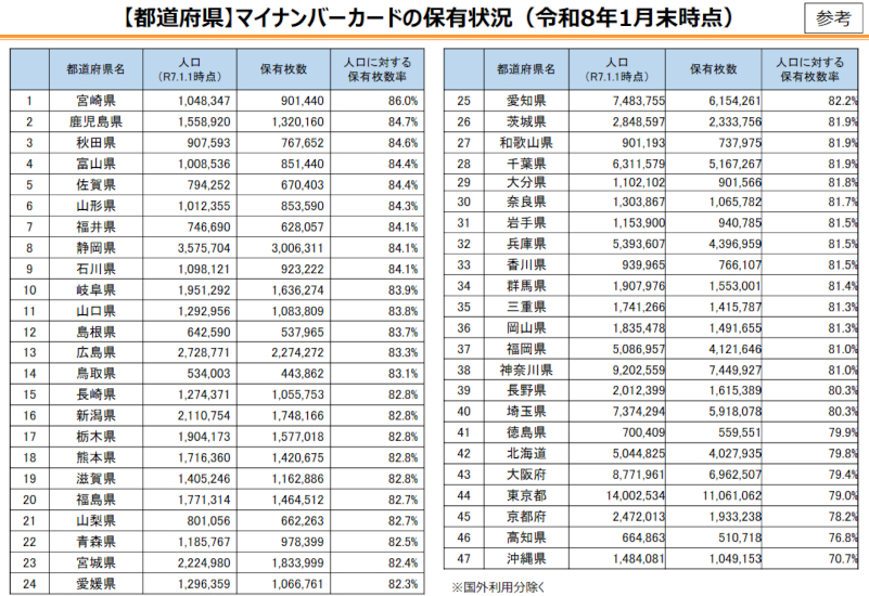 26年1月末時点のマイナンバーカード保有枚数率は81.2% 東京や神奈川は平均を下回る 2026/02/10 19:00 Tweet 1/2 直近の1日あたりの平均申請・交付件数、月末時点の人口に対する割合(保有率)の推移 記事詳細ページ 注目の記事 スマホ対応でますます便利になる確定申告 ただし事前準備は必要 始まってます!「マイナ保険証」&「マイナ免許証」 各種オンライン申込や救急などでの活用も 【2025年最新】マイナンバーカードの連携メリットは?連携できるものやスケジュールを紹介 22年11月末時点のマイナンバーカード交付枚数率は53.9% 都道府県別1位は宮崎県 「マイナポイント」で普及加速 22年4月時点のマイナンバーカード交付枚数率は43.3%、5~9歳でも3割超える 外部リンク 「マイナンバーカードの交付状況について」=https://www.soumu.go.jp/kojinbango_card/kofujokyo.html 「マイナンバーカード(デジタル庁)」=https://www.digital.go.jp/policies/mynumber 「国税庁 確定申告書等作成コーナー」=https://www.keisan.nta.go.jp/kyoutu/ky/sm/top デジタル庁=https://www.digital.go.jp/