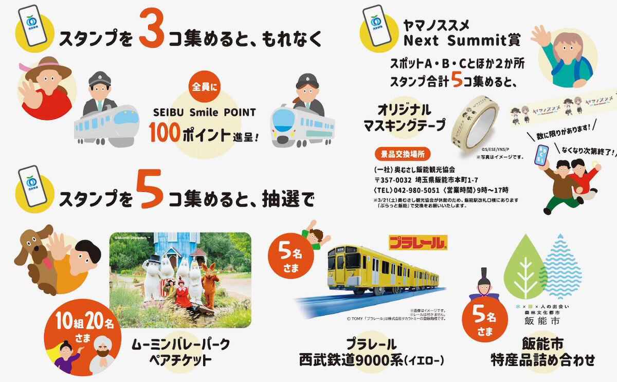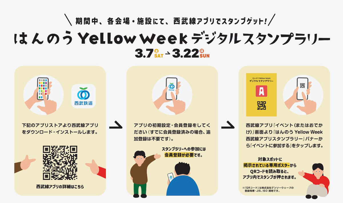 デジタルスタンプラリーやマルシェなど! 「はんのう Yellow Week」 2月24日から 2026/02/20 17:30 Tweet 1/6 「はんのう Yellow Week 西武線アプリスタンプラリー」の賞品 記事詳細ページ 注目の記事 デジタルスタンプラリーやマルシェ開催 16日間の移住促進イベント 3月1日から 西武鉄道、「タッチ決済乗車」の利用駅を拡大 3月25日から58駅で 西武鉄道とJR東日本、初の直通運転!? 両社の「ポイント」からルートを考えてみる 鉄道利用でお得なクレカ「Laviewカード」 デビューキャンペーンでチケットレスサービス「Smooz」購入の特急券・指定券が3万円を上限に全額キャッシュバック 今年は鉄道開業150年! JR東日本の記念映像がネットで話題 有料着席サービス拡大の兆しも 外部リンク 西武鉄道=https://www.seiburailway.jp/ 「はんのう Yellow Week~早春の飯能を楽しむ、27日間~」=https://han-note.com/event/hyw2026.html 「『トキイロ』特設サイト」=https://www.seiburailway.jp/railways/tokiiro/