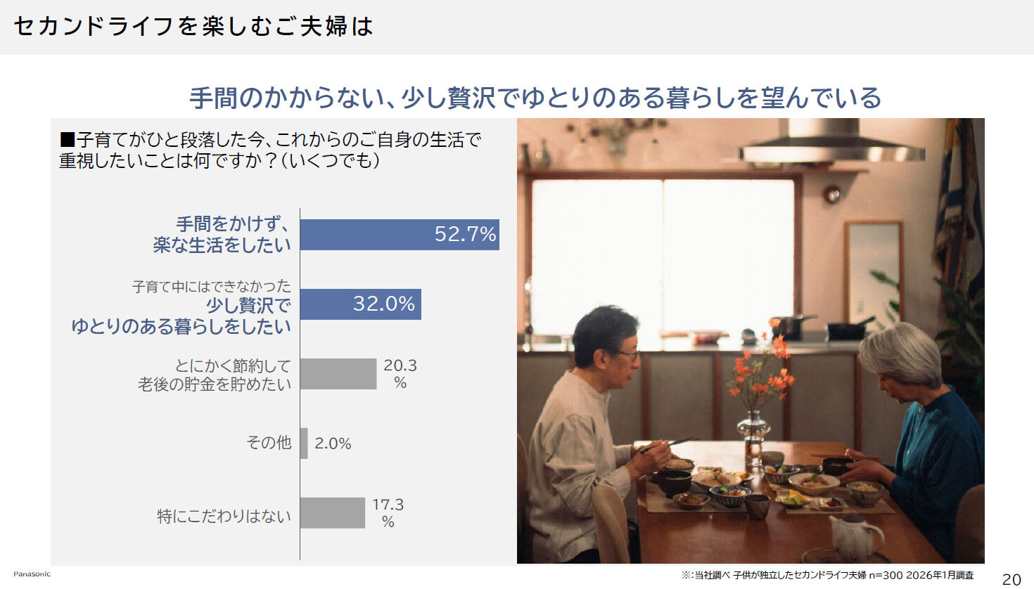 パナソニックの「小世帯」向け家電は「ひとり暮らし」だけじゃない!「共働き夫婦」「セカンドライフ夫婦」にも幅広く提案できる 2026/03/17 16:05 Tweet 1/16 パナソニックの小世帯向け家電 記事詳細ページ 注目の記事 パナソニックは小世帯向けに食の提案を推進 “コンパクト”ד上質”のキッチン家電で食材を最後までおいしく食べ切ろう 限られた時間やスペースを有効活用しよう! パナソニックは小世帯向けに時間と空間のゆとりあるくらしを提案 パナソニックが小世帯にフォーカスした商品群の提案を開始 キーワードは「コンパクトなのに上質で心地よく過ごせる家電」 急に寒くなって体調を崩しがち、パナソニックが「リフ活家電」で体の「ととのえ」を提案 パナソニック、大ヒット「パームイン」の心臓部・彦根工場を公開 外部リンク パナソニック=https://panasonic.jp/ 「わたしにも、ふたりにも、心地よく。」=https://panasonic.jp/life/special_12.html