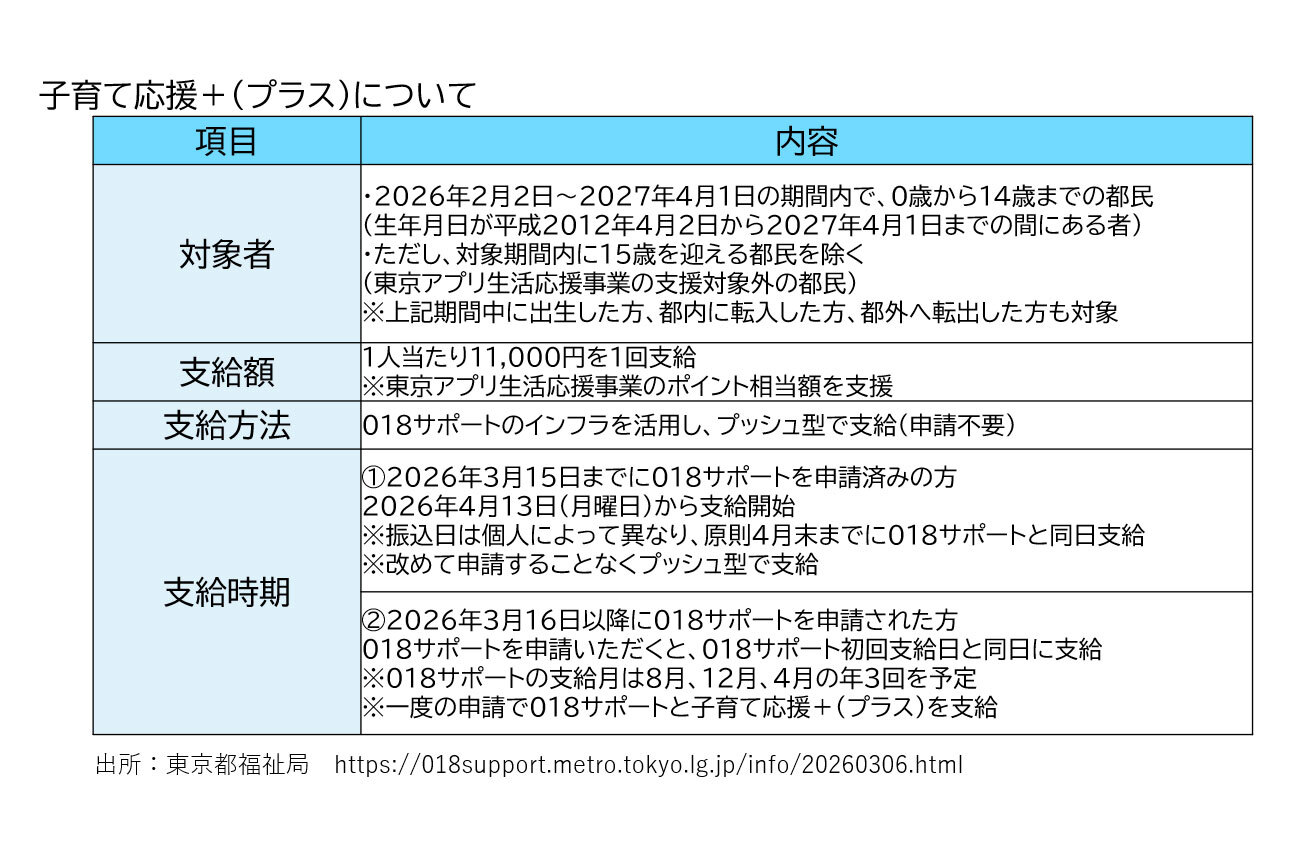 • 東京都、「子育て応援+(プラス)」開始 東京アプリ生活応援事業対象外の15歳未満に1回1万1000円を給付