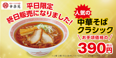 幸楽苑、「中華そばクラシック」を390円で平日・終日販売!