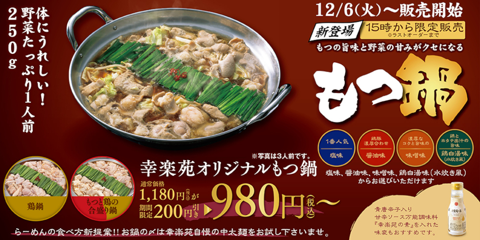 幸楽苑で「もつ鍋」もあり 自慢の4種類のスープから選べる