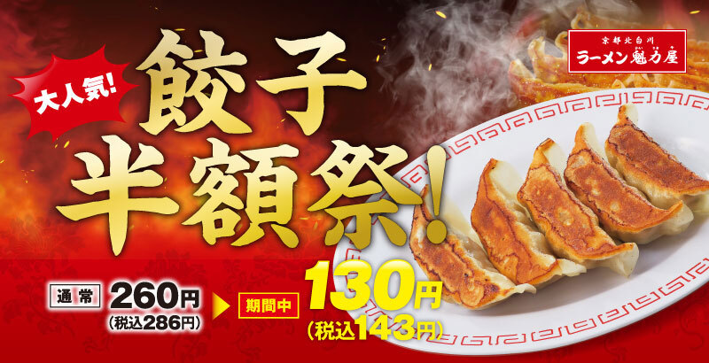 京都北白川ラーメン「魁力屋」、本日から「餃子5個」が何人前でも半額に!