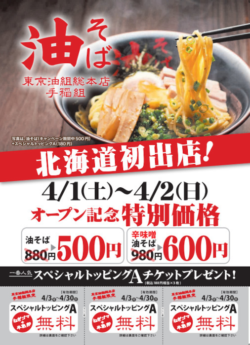 油そば「一杯500円」のオープン記念も 「東京油組総本店」が北海道に初出店