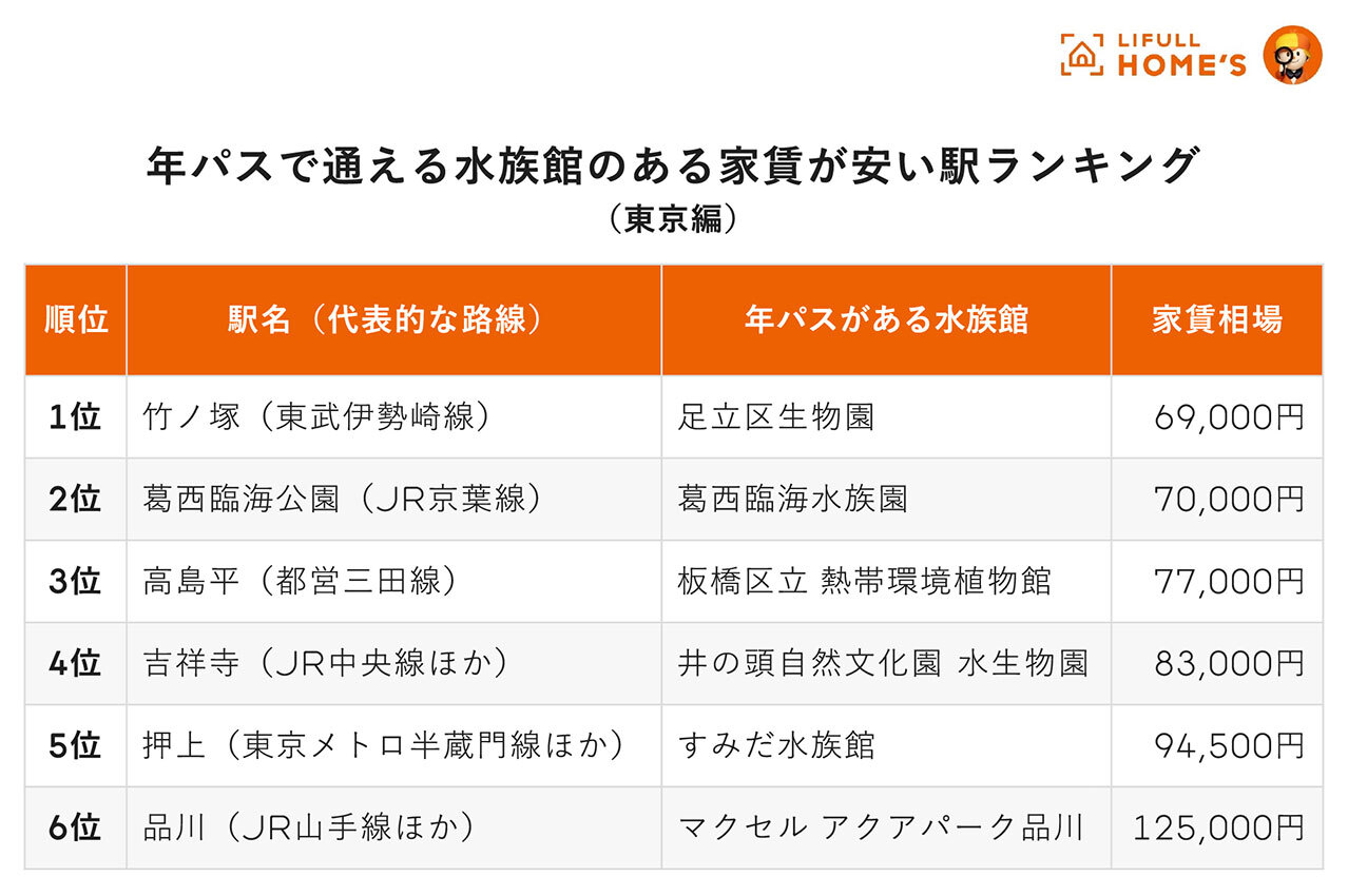 • 「年パス」で通える水族館のある東京都内の家賃が安い駅は?
