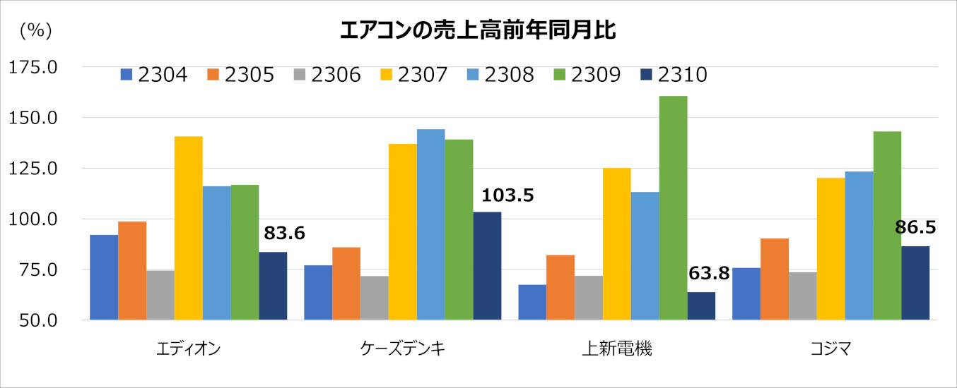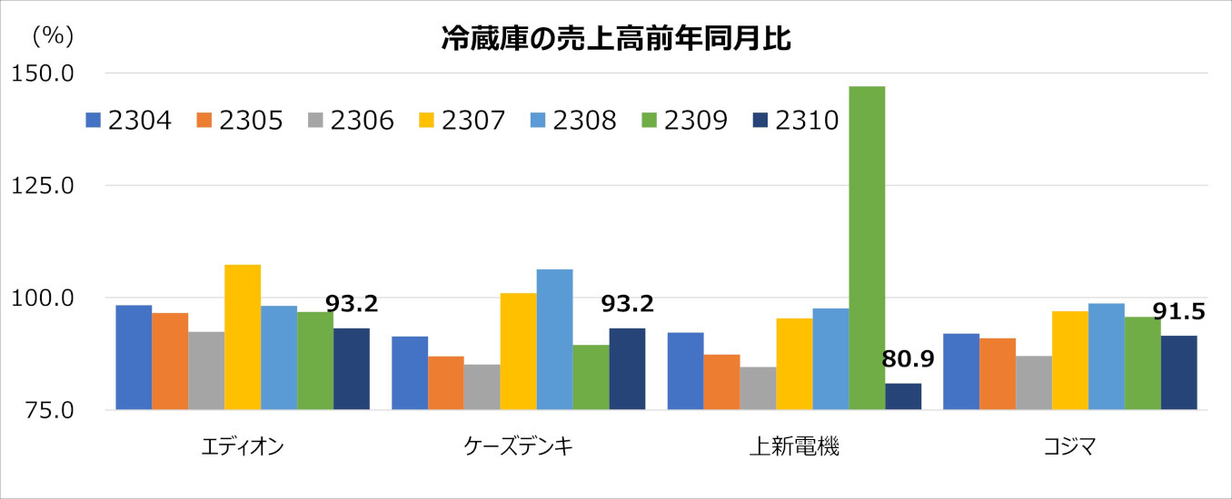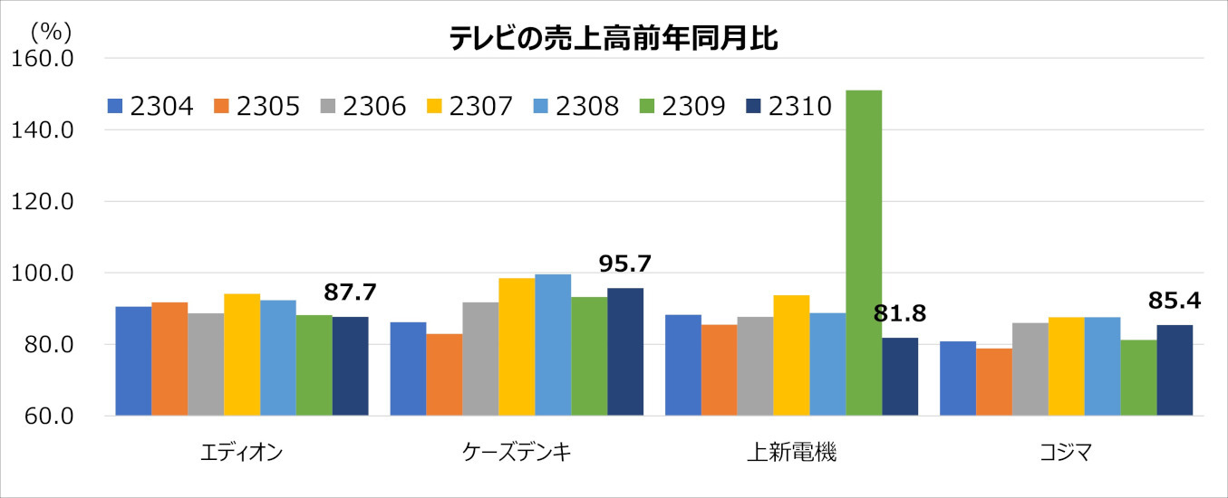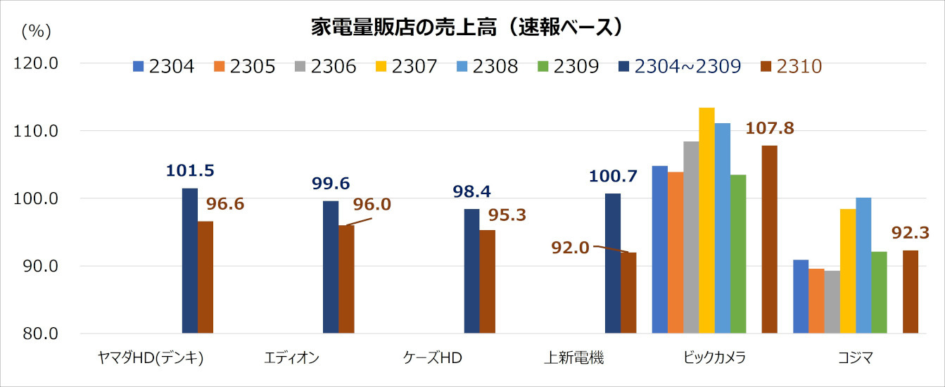家電量販店の10月売上高はビックカメラが前年同月実績プラスだが各社は前同比90%台にとどまる