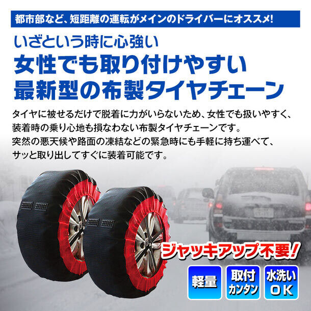 • 突然の雪や路面凍結も安心! ジャッキアップ不要の「布製タイヤチェーン」