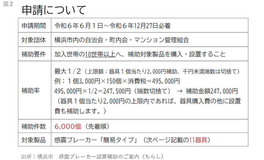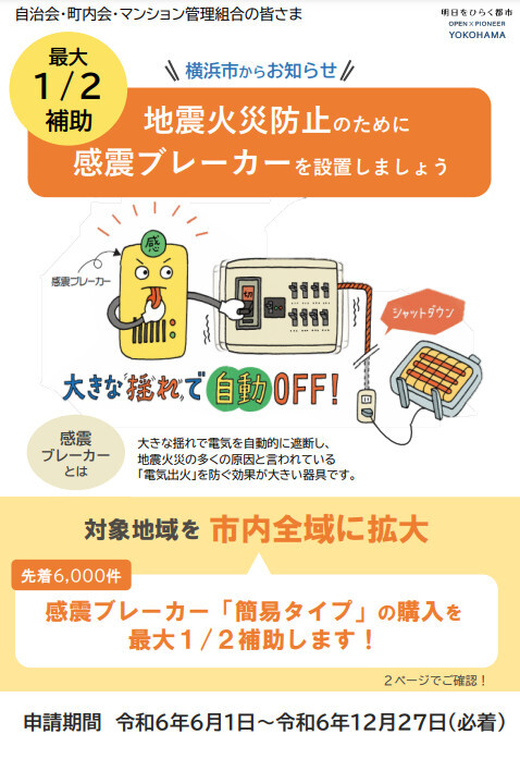 - 横浜市|感震ブレーカー設置補助のご案内(ちらし)=https://www.city.yokohama.lg.jp/bousai-kyukyu-bohan/bousai-saigai/moshimo/wagaya/jishin/sonae/kanshin.files/0069_20240516.pdf