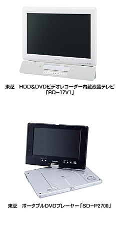 東芝は、業界で初めてHDD&DVDビデオレコーダーと液晶テレビを一体化した「RD-17V1」を12月上旬に発売する。あわせて、ポータブルDVDプレーヤーの新製品として、高精細な8.9V型ワイド液晶を採用した「SD-P2700」も12月上旬に発売する。価格はともにオープンで、実勢価格は「RD-17V1」が16万円前後、「SD-P2700」が7万円前後。