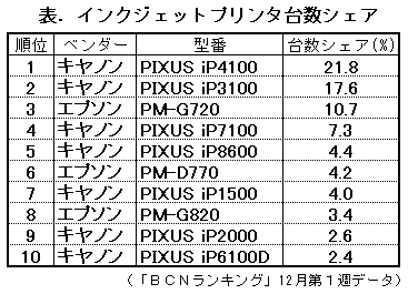 年末商戦のプリンタ市場で、エプソンとキヤノンが大激戦を演じている。インクジェットプリンタでは、キヤノンの独走体制が鮮明になってきた。複合プリンタでエプソンがトップ3位を独占する一方で、キヤノンはプリンタ単体機にボックス型の新デザインと、2pl(ピコリットル)のスーパーフォトノズルによる高画質プリンタを投入、ついに69%のシェアを獲得した。