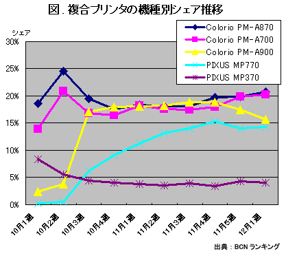 図は、BCNが大手量販店17社1500店舗のPOSデータを集計する「BCNランキング」で、売れ筋上位5機種のシェア推移を示したグラフ。このうち3機種が激しくトップ争いを演じているが、実はいずれもエプソンの新製品。とくに実勢価格5万円弱というハイエンドモデルの「Colorio PM-A900」(黄色の折れ線)や、3万4000円前後の「Colorio PM-A870」(青色の折れ線)という、上位モデルに人気が集中している。