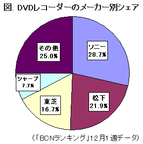 今年のDVDレコーダー年末商戦は、まさしくソニー「スゴ録」とパナソニック「DIGAシリーズ」の一騎打ちの様相を呈している。全国の大手家電量販店17社1500店舗のPOSデータを集計した「BCNランキング」によると、メーカーシェアはソニーが28.7%、松下が21.9%、やや遅れて東芝、シャープが両社に続くという展開になっている(図)。