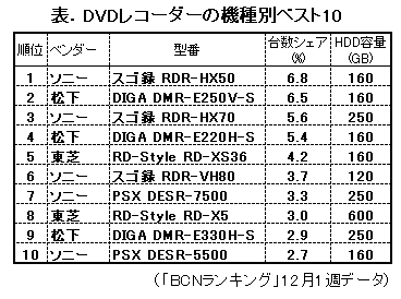 機種別ベスト10(表)では、スゴ録は1、3、6位、DIGAは2、4、9位を獲得。「スゴ録」対「DIGA」が師走の店頭で激しく火花を散らしている。