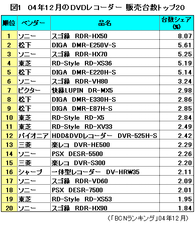 2004年、DVDレコーダー年末商戦で一騎打ちとなったソニー「スゴ録」と松下「DIGA」。対決は11月最終週まで目が離せない一進一退のデッドヒートを繰り広げ、最終的にソニーに軍配が上がった。まずは12月におけるDVDレコーダートップ20を見てみよう(図1)。