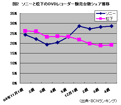 一方の松下は、2番組を録画できる「どっちも録り」や他の製品とのネットワーク機能、わかりやすいEPGや簡単UIと、あまりに機能が豊富すぎて、「DIGA」としての訴求ポイントが分散したきらいがある。さらに、エントリーとなる普及価格帯モデルにおいて、「DIGA」は「DMR-E55」の1機種に対し、「スゴ録」は「RDR-HX50」と「RDR-HX70」、そして「PSX」の「DESR-5500」と、3機種を揃えて一般のエントリーユーザー向けに幅広いラインアップを提供した。こうした差が12月4週には、ソニー28.6%、松下19.2%となって表れることとなった。