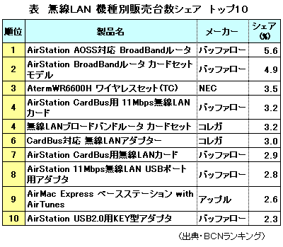無線LANといえば、かつてはパソコンマニア向けの製品というイメージが強かった。ところが、家電感覚で導入する女性や初心者ユーザーが増えているのが最近の傾向だという。表の無線LANの売れ筋ベスト10をみると、ネットワークの構築に必要な機器が一式揃ったセットモデルが中心。確かに初心者でも気軽に導入できる製品が主流となっている。
