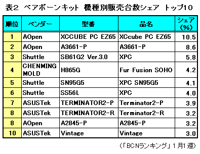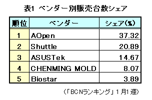 1月1週(1月3日?9日)のBCNランキングでベンダー別のシェアに目を向けてみると、マザーボードを始めとするPCアセンブリパーツでお馴染みのAOpenが全体のシェア37.32%でトップ、次いでShuttle(20.89%)、ASUSTek(14.67%)といった、AOpen同様のPCアセンブリパーツメーカーが続く。(表1)とくにAOpenは、ベアボーンキット市場参入は意外にも03年中旬と遅いにも関わらず、積極的にラインアップの充実化を図り、着々と売り上げを伸ばしてきた。