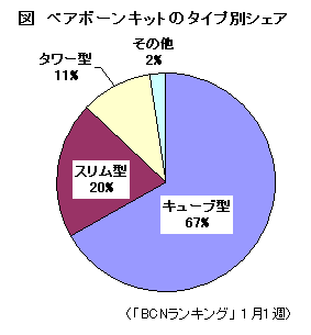 各社の製品のなかでも、とくに売れ筋なのが、適度な拡張性とコンパクト性を両立させた「キューブ型」だ。具体的にいえば、「適度な拡張性」とは、5.25インチ、3.5インチ、内蔵といった拡張ストレージベイを1つずつ、そしてPCIスロットを最低でも1つは備えていること。「コンパクト性」とは、横幅20cm以内、奥行き30cm以内、高さ20cm以内といった限りなくスクエアに近い形状のケース(つまりキューブ型)であることを意味している。実際にベアボーンキット市場ではキューブ型が7割近くを占め、「ベアボーン=キューブ型」という考えがユーザーの間に定着しているようだ。(図)