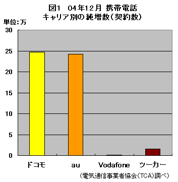 2004年12月の携帯電話の年末商戦で純増数1位を獲得したのは、NTTドコモだった。電気通信事業者協会(TCA)が発表したデータによると、12月の純増数はauが24万1600、NTTドコモが24万7500と、わずかにドコモがauを上回ってシェア1位となった(図1)。
