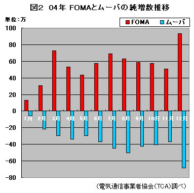 04年度には、ムーバの純減がFOMAの伸びを打ち消してしまうほど不振な月もあったが、昨年12月はFOMAの純増93万100に対し、ムーバの純減は68万2700にとどまったのも大きい(図2)。これは「premini-S」などのデザインに特化した端末が、ムーバの純減に一定の歯止めをかけたためと推測される。
