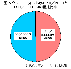 ユニットの種類も豊富で、入門向けのローエンドタイプから、本格的なプロ志向のハイエンドタイプまで、あらゆるユーザーのニーズに対応する点も人気の秘密。これまでは、デスクトップPCユーザーを対象としたPCIカードタイプが中心だったサウンドカード市場も、現在ではUSB/IEEE1394対応の外付けサウンドユニットの構成比率が50%近くまで上昇。確実にユーザーの間に浸透してきている(図)。