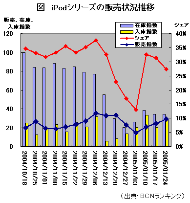 11月末までは35%前後と好調にシェアを伸ばしてきたが、12月に入ったとたん、一転して失速状態ともいえる急落となった。ちょうど年末商戦のさなか。「iPod」は商戦の目玉商品とうたわれるほどの人気ぶりだった。にもかかわらず、この時期、「iPod」のシェアは一気に13%まで急落していた。下がったのは、シェアばかりではない。実は、販売(青い折れ線)そのものが、年末年始商戦にも関わらず、この3か月で最も落ち込んでいたのである。