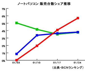 1月4週(1月24日?30日)、ノートパソコン機種別ランキングで、NECの「LaVie L(LL750/BD)」がトップに躍り出た。1月に発売された各メーカーの春モデルのなかで、初のトップ獲得となり、先行していた富士通「FMV-BIBLO(FMVNB50K)」との首位争いを制した。