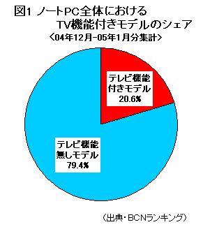 まずは「BCNランキング」から、TV機能付きノートパソコンの販売状況をチェックしてみよう。図1は、2004年12月から2005年1月までの2か月間のノートパソコン実売データから、TV機能付きモデルの構成比率を算出したものだ。これによると、全体のうち実に20.6%がTV機能付きノートパソコンとなっている。ノートパソコンが5台売れると、そのうちの1台はTV機能付きというわけだ。平均的な実売価格も16?17万円というラインに下降してきており、この流れはますます加速していくことだろう。