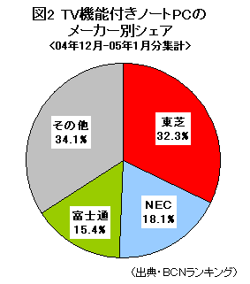 さらに、TV機能付きノートパソコンのメーカー別シェアを集計してみたのが図2だ。ノートパソコン全体で考えれば、富士通やNECが入ってくるのは当然だが、ここでトップシェアを獲得したのはなんと東芝。低価格の「dynabook TX」は当然として、高付加価値モデルである「dynabook Qosmio」も、かなり順調な売れ行きを示しているのである。TVをパソコンで見る場合、やはり一番気になるのは画質。その点、各種高画質化回路をふんだんに取り込んで画質面の向上を図ったこと、そして実売価格で15万円以下という驚異の低価格モデルをラインアップしたことが東芝の勝因だろう。
