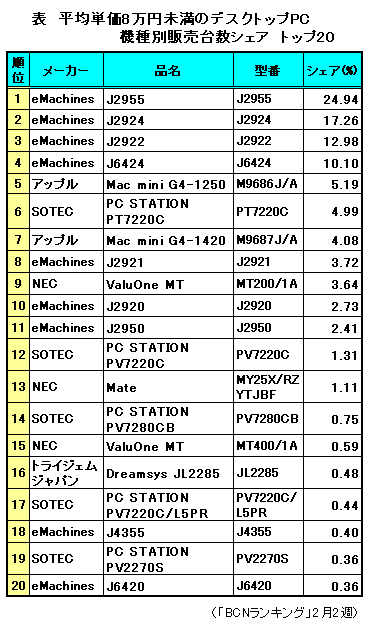 NECでは、主軸のVALUESTARシリーズとは全く異なるシンプル・低価格路線の新シリーズ「ValueOneシリーズ」をラインアップ。シリーズの上位機種である「MT400/1A」が店頭価格7万円台中盤、下位機種の「MT200/1A」については6万円台中盤と、激安路線の他メーカーと真っ向から張り合う低価格路線をとっており、この市場での同社の意気込みが伺える。「BCNランキング」2月2週から、平均単価8万円未満のデスクトップPC販売台数シェアトップ20をみると、早くも9位に「MT200/1A」がランクインしている(表)。