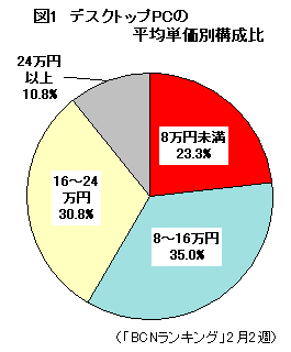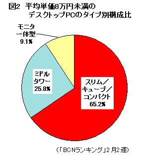 それでは、ここで低価格路線デスクトップPCの特徴をみてみよう。2月2週のデスクトップPC全体における、平均単価8万円未満モデルの構成比率は23.3%(図1)。昨今のデスクトップPCの多くは、DVDでの動画鑑賞やTV鑑賞機能、サラウンドスピーカーシステムによる強力なAV機能など、エンタテインメント機能を充実させたものが多かったが、低価格路線デスクトップをみると総じてシンプルな構成のものが多い。