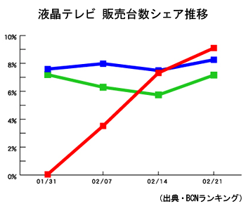 「BCNランキング」2月3週(2月21日?2月27日)、液晶テレビ機種別販売台数シェアで、2月24日発売のシャープ「AQUOS(LC-32AD5)」が、いきなりトップに立った。32V型の大画面モデルながら絶好調の出足で、売れ筋である13?15型の普及モデルを抑え、今年発売された新製品のなかでは、一番乗りでトップを獲得した。
