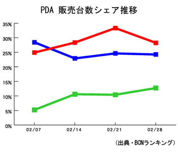 2月22日、ソニーが「クリエ」の新機種投入を終了し、7月に生産中止することを明らかにしたが、そのタイミングにあわせたかのように、「PEG-TH55」のシェアも上昇。すでに事前から噂が流れはじめていたのか、撤退発表の前週となる2月2週に「Zaurus(SL-C3000)」からトップを奪還し、3週連続でトップをキープし続けている。まだ、大きな値崩れも起こっていないことから、撤退報道によってユーザーの購買意欲が刺激されたことがシェアアップの一因と思われる。