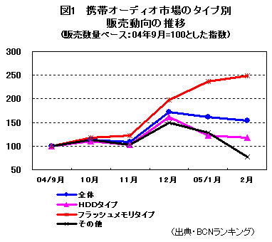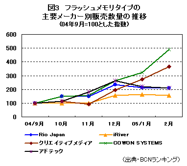 フラッシュメモリタイプの携帯オーディオの主要メーカー別販売動向をみると、04年12月から05年2月の間でRio Japan、iRiverなどの増勢傾向が鈍化している(図3)。04年12月から翌1月にかけては、クリスマス需要の反動減もあろうが、その後2月までの落ち込みについては、アップルのフラッシュメモリタイプ市場参入による競合激化が要因と思われる。
