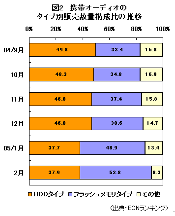 この要因となったのは、05年1月のアップルによる「iPod shuffle」の投入である。これまでもフラッシュメモリタイプの市場は増勢傾向で推移し、携帯オーディオ市場内でのシェアも緩やかながら拡大していた。しかし、アップルの参入により、携帯オーディオ市場におけるフラッシュメモリタイプのシェアは04年12月の38.6%から05年1月には48.9%に拡大。2月には53.8%と過半数を占めるに至り、携帯オーディオ市場のなかでの存在感が急速に増している(図2)。