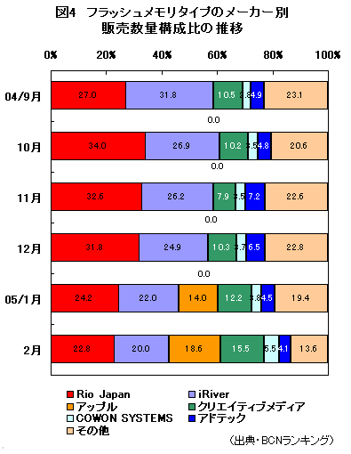 同様にフラッシュメモリタイプの主要メーカー別販売数量構成比をみると、アップル参入以前の04年12月までは、Rio Japan、iRiverが2社で市場の過半数を占める2強体制となっていたが、05年1月以降は、アップルを含めた3強体制へと移行している(図4)。